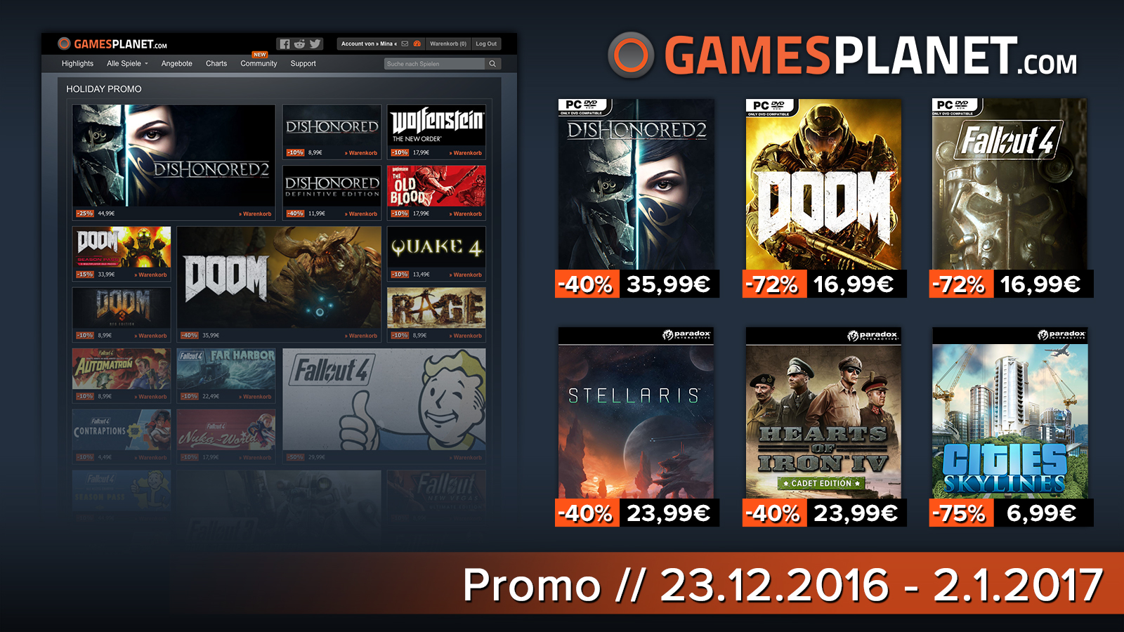 Parmi plus de 100 jeux soldés, vous trouverez les séries Dishonored, DOOM, Fallout, Cities Skylines, The Elder Scrolls, Wolfenstein, Stellaris, Evil Within, Pillars of Eternity et quelques-un des meilleurs jeux indépendants en 2016 !